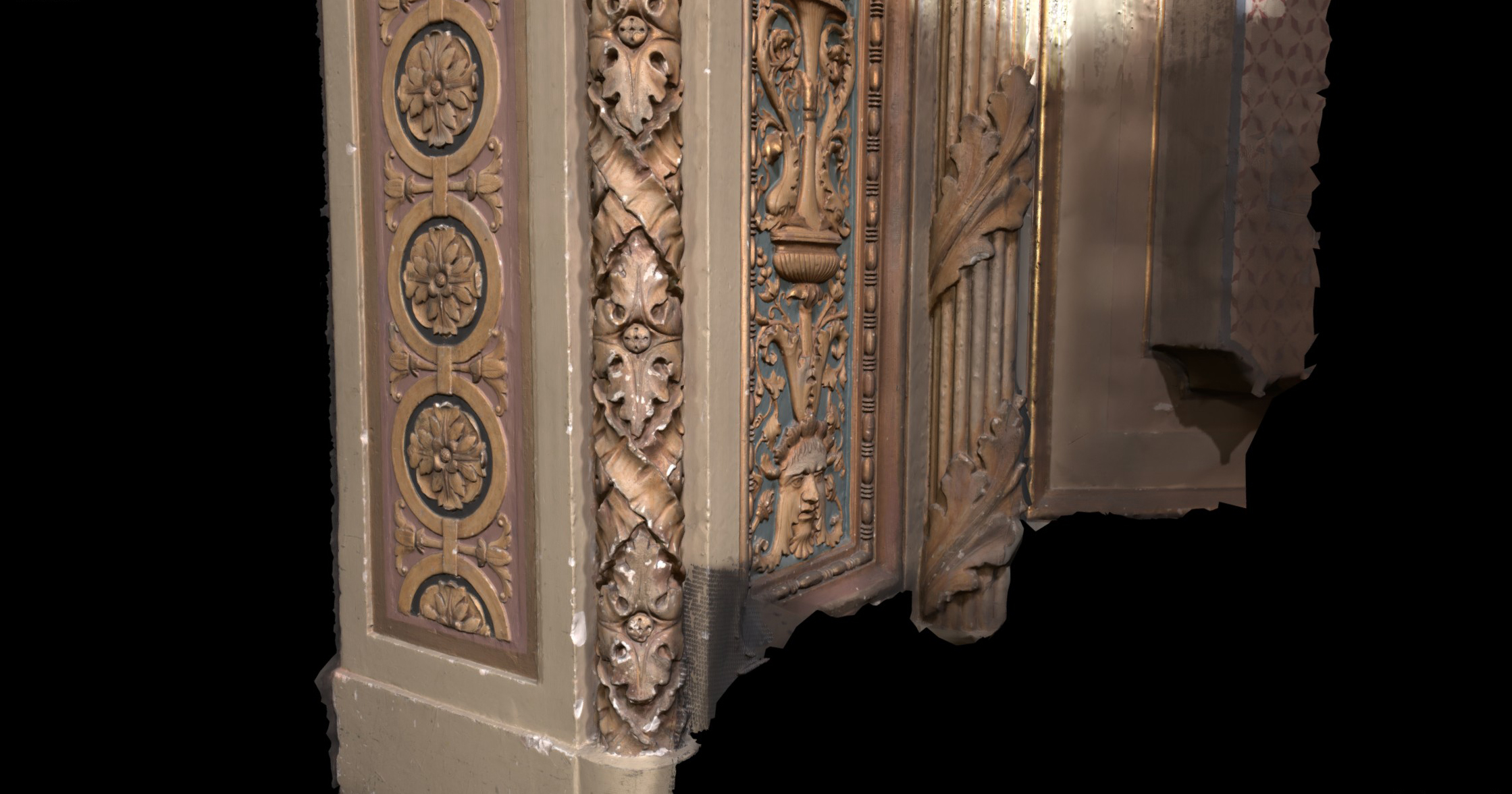 Les éléments architecturaux de la salle-J-A. Thompson contribuent grandement à sa valeur esthétique et patrimoniale. Afin de conserver son caractère unique iSCAN a procédé à la numérisation par scan 3D et photogrammétrie des éléments architecturaux significatifs de la salle. Cette démarche a permis de documenter avec précision les détails patrimoniaux et les particularités historiques en vue de leur conservation. Les relevés obtenus constituent ainsi une base fiable pour les interventions de restauration et l’archivage numérique du site.